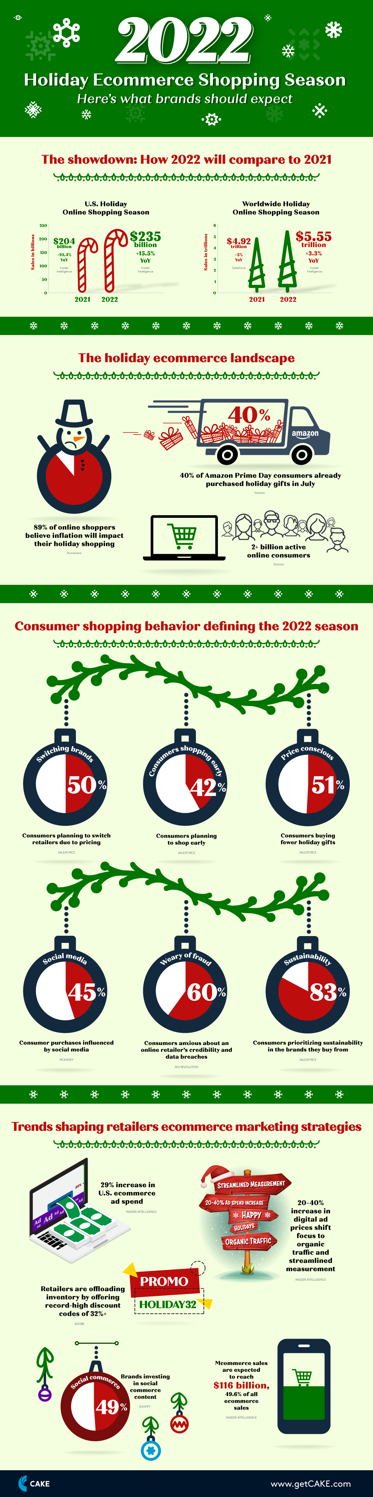 Explore the infographic below to learn about the market size, retail sales projections, consumer behavior, and brand strategies that will define this year’s holiday ecommerce season.