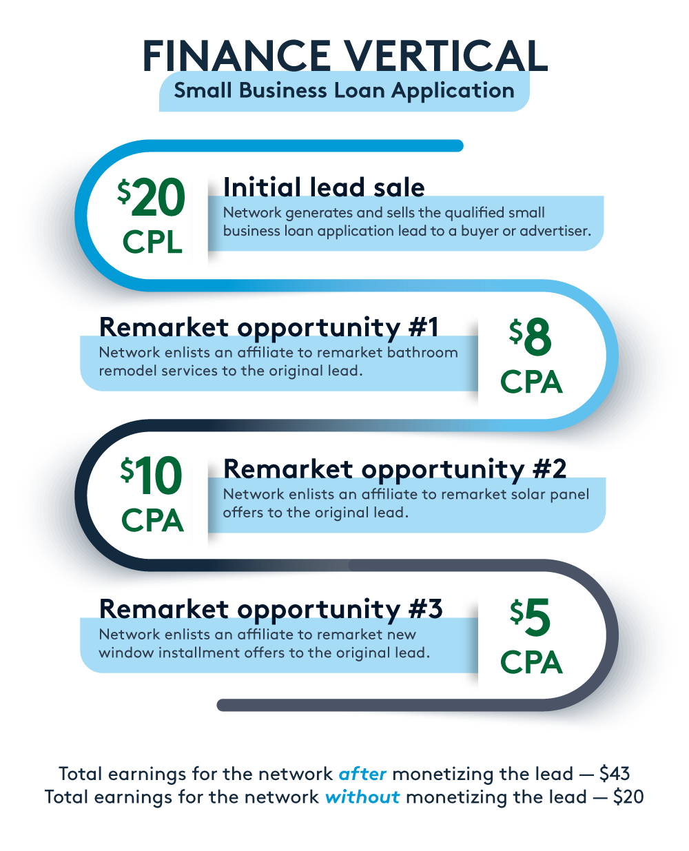 Plus, if exclusive advertiser contracts are in place, networks legally cannot resell or remarket to the lead with a direct competitor of the original advertiser. Remarketing to the lead with a complementary or different vertical altogether is the best path forward. The new verticals might be complementary to the network’s core vertical(s) or entirely different.