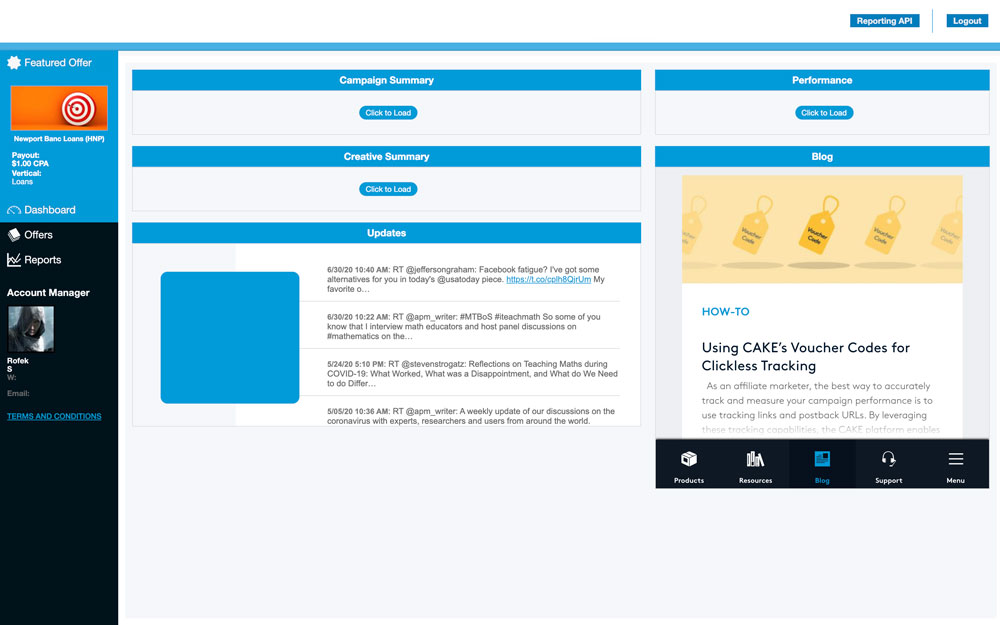 The CAKE platform makes it easy to customize the Affiliate Portal Dashboard with your Twitter feed (Updates), a summary of the Featured Offer, and an embedded web page via iFrame.